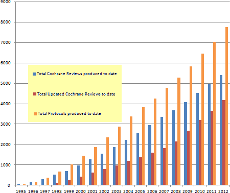 The CDSR now includes over 5200 Cochrane Reviews and 7500 protocols for Cochrane Reviews (Figure 1), each a collaboration by a research team and one of 53 Cochrane Review Groups. Each Review Group focuses on a different healthcare area, such as pregnancy and childbirth, infectious diseases, and the effective practice and organisation of care. As the numbers of reviews have increased, there has been growth in the use and impact of Cochrane Reviews, including their inclusion in clinical guidelines. As Peter Langhorne, Co‐ordinating Editor of the Cochrane Stroke Group, says the in video: “All the Western guidelines [on stroke] are similar and all reference Cochrane Reviews in large numbers. It's become embedded in the normal practice of quality improvement.” Cochrane Reviews have also informed aspects of healthcare research and methodology developments for systematic reviews, and have led indirectly to clinical trial registration and improved standards for the conduct and reporting of trials.