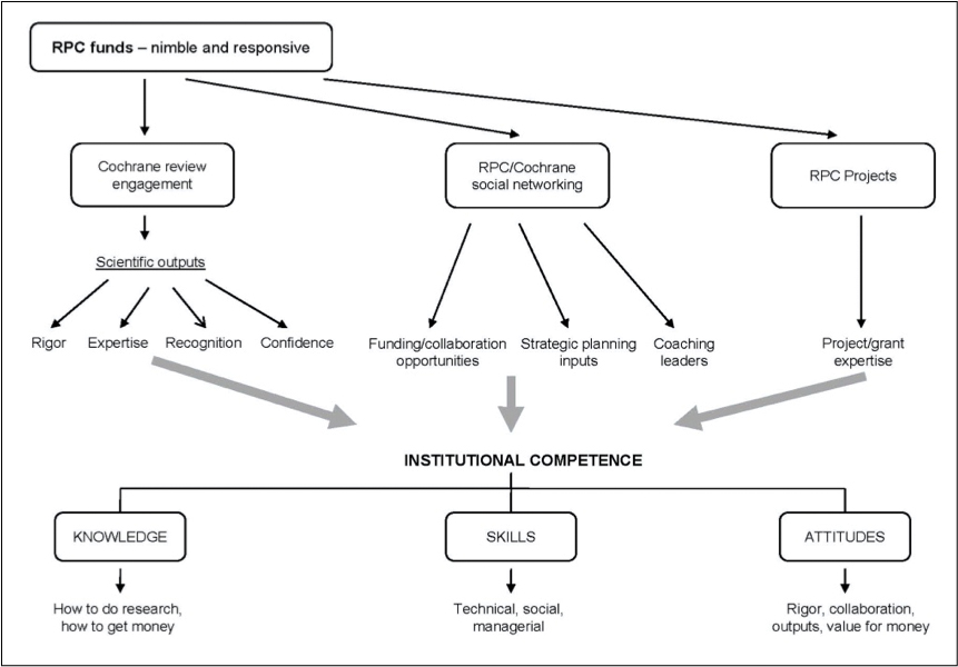 Managing and financing capacity building needs care. The Collaboration has valued individual effort and enthusiasm, and that has largely avoided the perverse incentives associated with competitive grants and academia in general. But capacity building and Cochrane Reviews both need investment, particularly as carrying out reviews becomes more demanding. In our own experience as part of a UK Aid programme‐funded consortium that supports Cochrane Review production, promotes their use, and is committed to capacity building, we have developed management approaches that have helped us and, in the spirit of the Collaboration, provide a base for others to build on and develop. With support from a strong advisory committee, we have set up a decentralised management structure to allow responsive funding with partners in the Consortium.[5] These partners have discretion on effective use of funds to achieve the programme outputs – to ‘get the job done’. Governance is through work plans developed within the explicit strategic priorities of the whole Consortium and negotiated within a management system in the Consortium framework working in line with the expectations from the funders. The work plans are formalised as output‐based contracts. Outputs are monitored six‐monthly, and the contracts are adjusted when appropriate. This active, transparent management with a focus on high‐priority review topics and with performance and year‐on‐year funding dependent on outputs provides a flexible and effective framework and high value for money. With review engagement, networking, and small scale audit and research projects, the grant aims to build institutional competence, conceptualised around knowledge, skills and attitudes to research, it builds research independence, which is the endgame we all seek (Figure 1).
